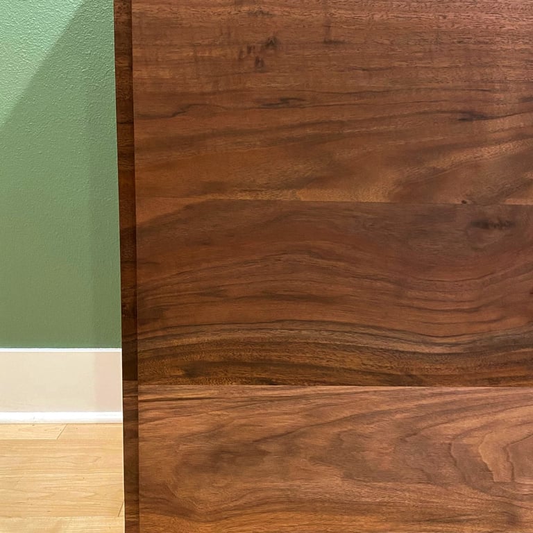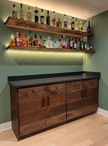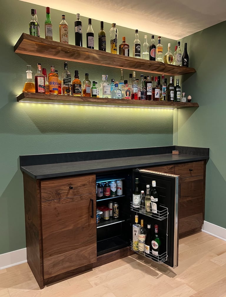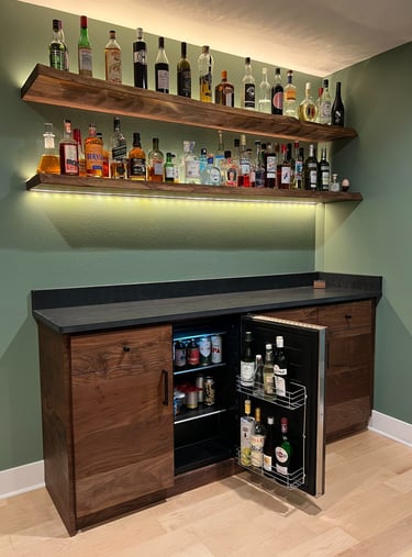 Wrapped in solid Oregon black walnut, the lower half of this home bar provides ample space to store glassware and bar tools alongside a concealed refrigerator.