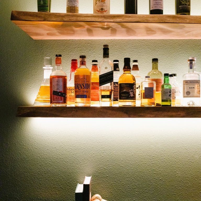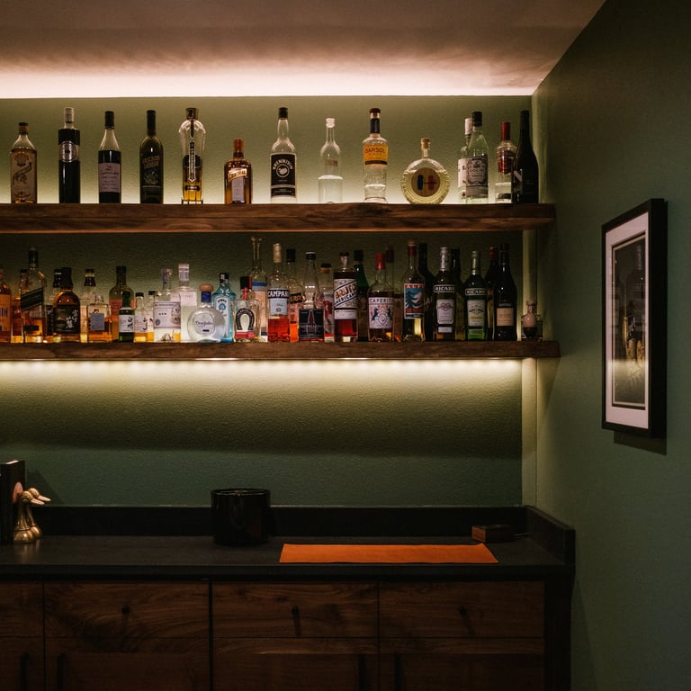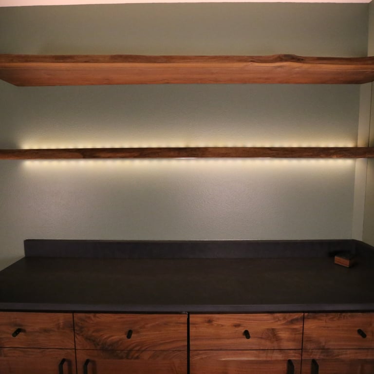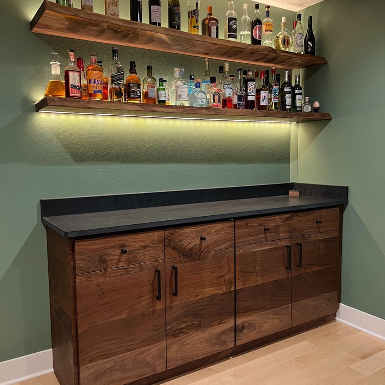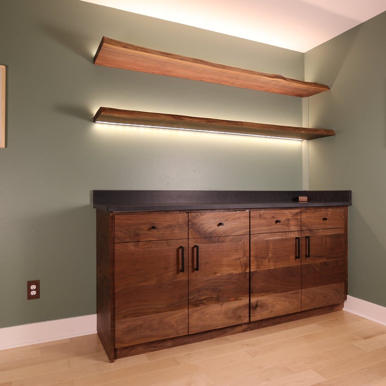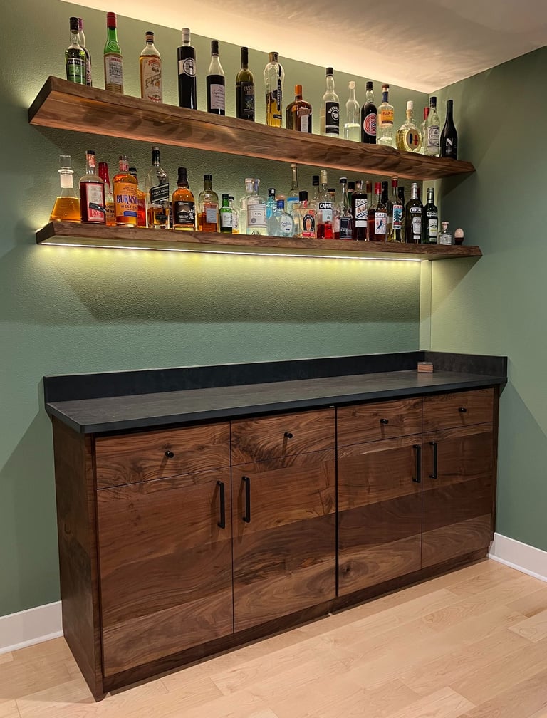 The live-edge shelves beautifully display a large collection of bottles, accented by LED lighting integrated into recessed channels at the rear of each shelf. The shelves were produced by cutting a single full-width slab in half lengthwise, to produce a pair of shelves with consistent color, grain pattern, and edge characteristics.