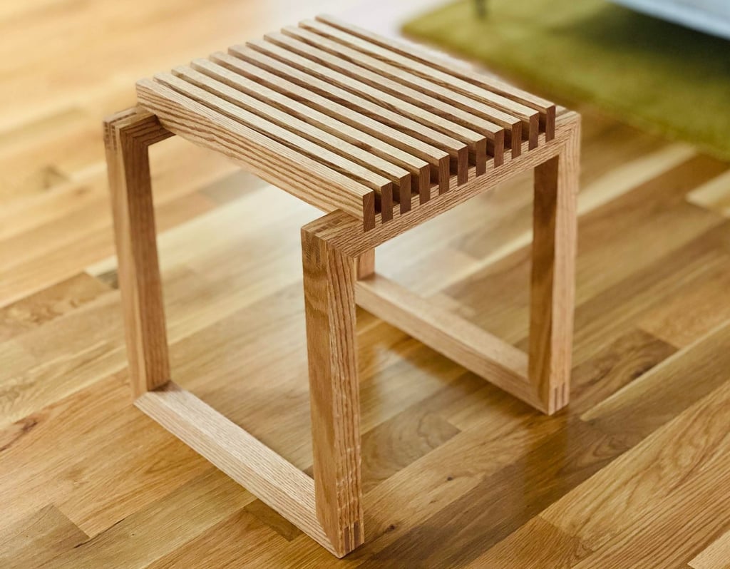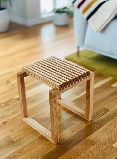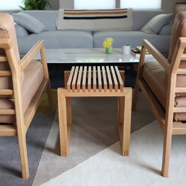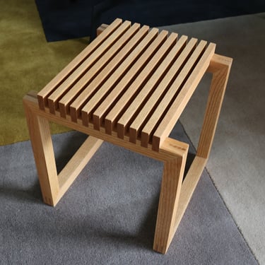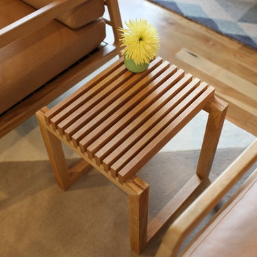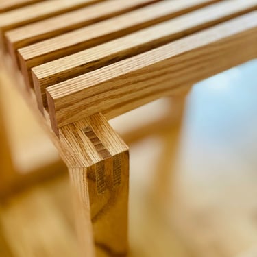 This side table – inspired by the Cutter Stool by Niels Hvass – features a series of slats set over a low-profile frame. The fully exposed mitered double-bridle joints at all eight corners provide additional visual interest.
